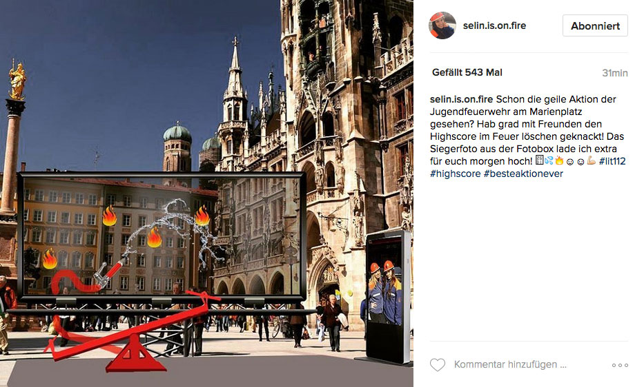 Wir haben uns die Aufgabe gestellt, eine neue Verknüpfung in den Köpfen der Jugendlichen zu schaffen: Jugendfeuerwehr = Team + Spaß. Ein interaktives Billboard wird platziert, das zum Mitmachen auffordert.