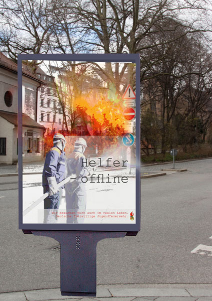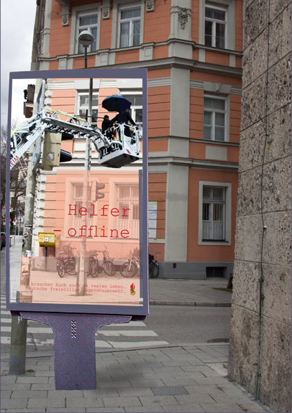 Aus diesem Grund haben wir uns an den neusten Trends orientiert und ein interaktives Board als Werbung gestaltet mit dem Slogan »Helfer – offline«. Sie zeigt eine virtuelle Szene in einem realen Umfeld, in der Feuerwehrübungen und Angebote der Jugendfeuerwehr zu sehen sind. Sie soll die Jugendlichen dazu begeistern, auch im echten Leben live dabei zu sein.