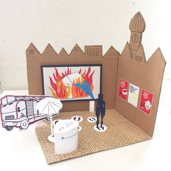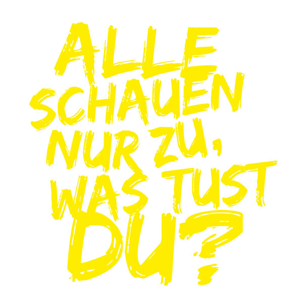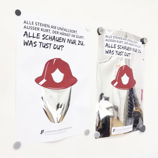 Ausgehend von der Recherche haben wir erkannt, dass es eine große Unkenntnis gibt. Unsere Idee setzt dort an. Die Zielgruppe möchten wir mit Humor erreichen, wesshalb bei unserer Kampagne deren Aufmerksamkeit mit bekannten Sprüchen erlangt wird. Diese sind humorvoll, makaber, informativ und werden mit unserem Slogan abgerundet, um zum Nachdenken anzuregen. Die Botschaft wird auf Plakaten mit eigener Hausschrift kommuniziert. Hier kann mit Spiegellack gearbeitet werden, sodass sich die Betrachter direkt in die Rolle hineinversetzen können. Andererseits gibt es Unterstützung von bekannten Street-Art-Künstlern, die die Sprüche verbreiten. Mit dem Hashtag #alleschauenzuwastustdu, kann ein Foto im Netz verbreitet und gleichzeitig an einem Gewinnspiel teilgenommen werden. Alles dies wirbt für eine Aktion, die jährlich am internationalen Tag der Feuerwehr stattfindet. Infostände, Spiele und ein temporärer Snapchatfilter sind vor Ort. Dies wird gefilmt und so auch in YouTube verbreitet.